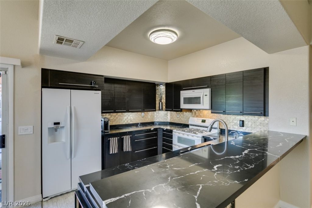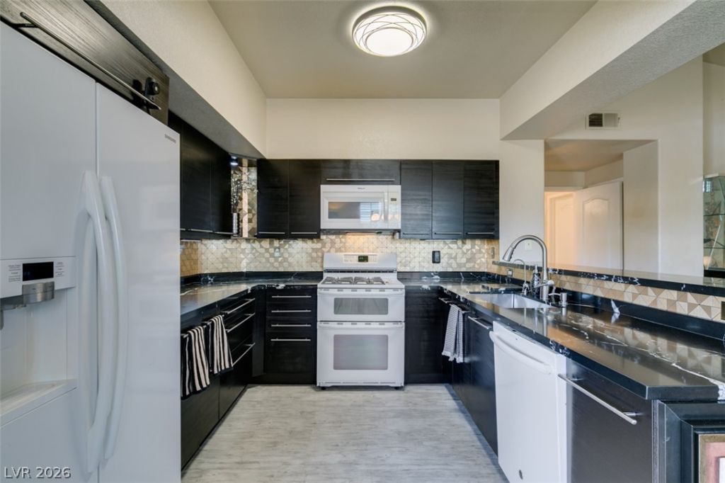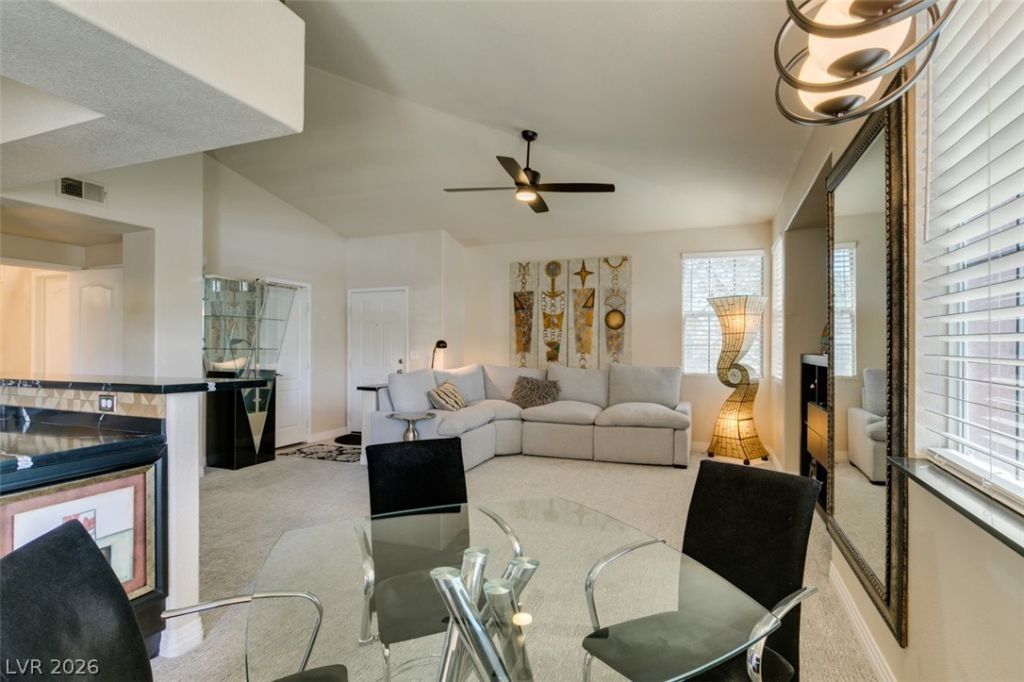 Move-in ready upgraded Summerlin condo featuring 2 bedrooms and 2 bathrooms with high vaulted ceilings and an open, airy layout. The spa-like bathrooms include an oversized soaking tub. The remodeled kitchen offers soft-close cabinets, lazy susan, reverse osmosis system , and pull-out trash for added functionality and convenience. Enjoy easy access with both interior and exterior stairwell entry, an attached garage, and ample storage throughout. Stay cool during the Las Vegas summers with a recently installed (2025) HVAC system and water heater- over $14k in upgrades. Located in a gated Summerlin community offering a gym, pool, RV parking, and ample guest parking. Ideally located near Pueblo Park with walking and biking paths, minutes from shopping, dining, and access to major freeways.